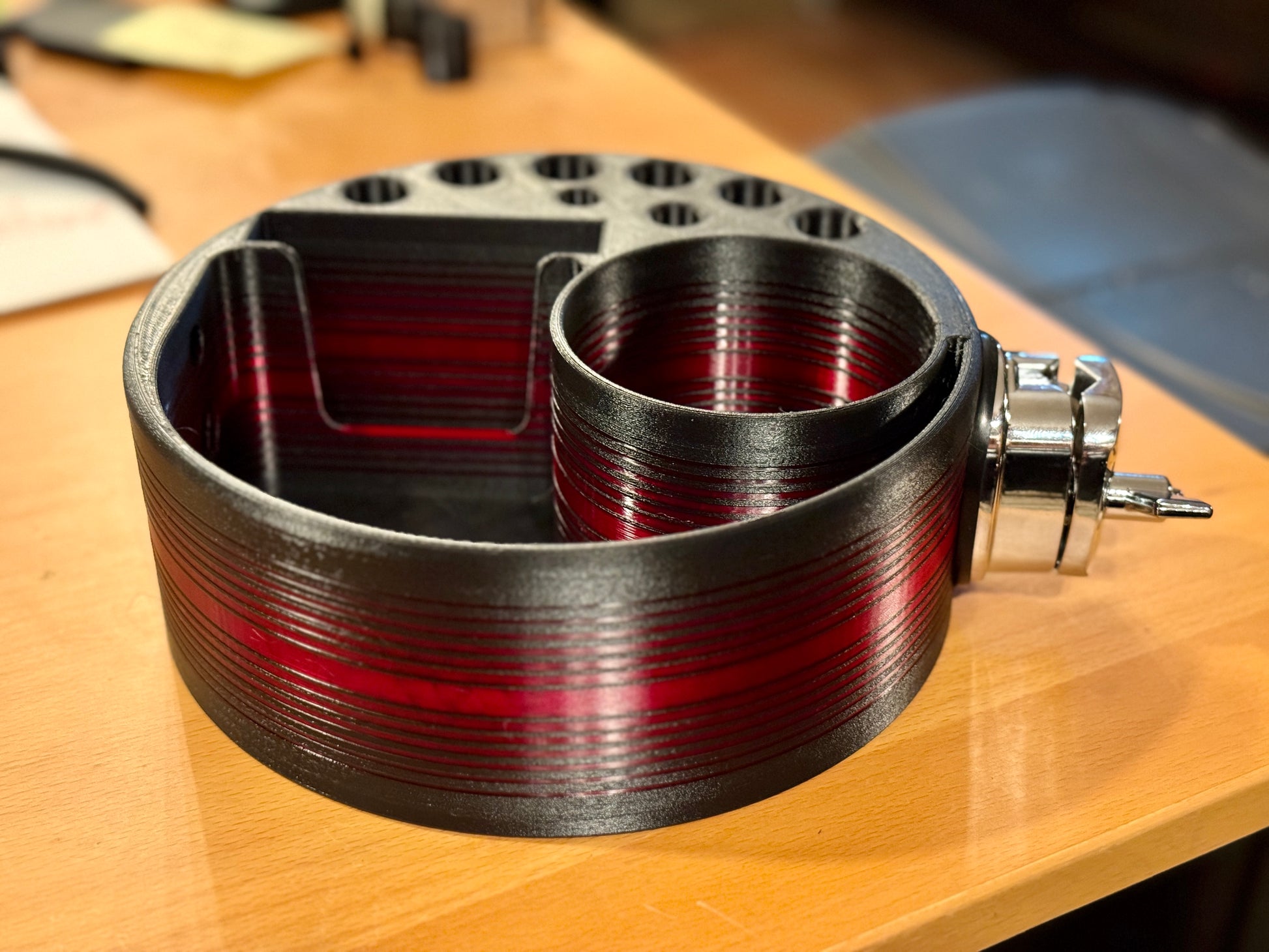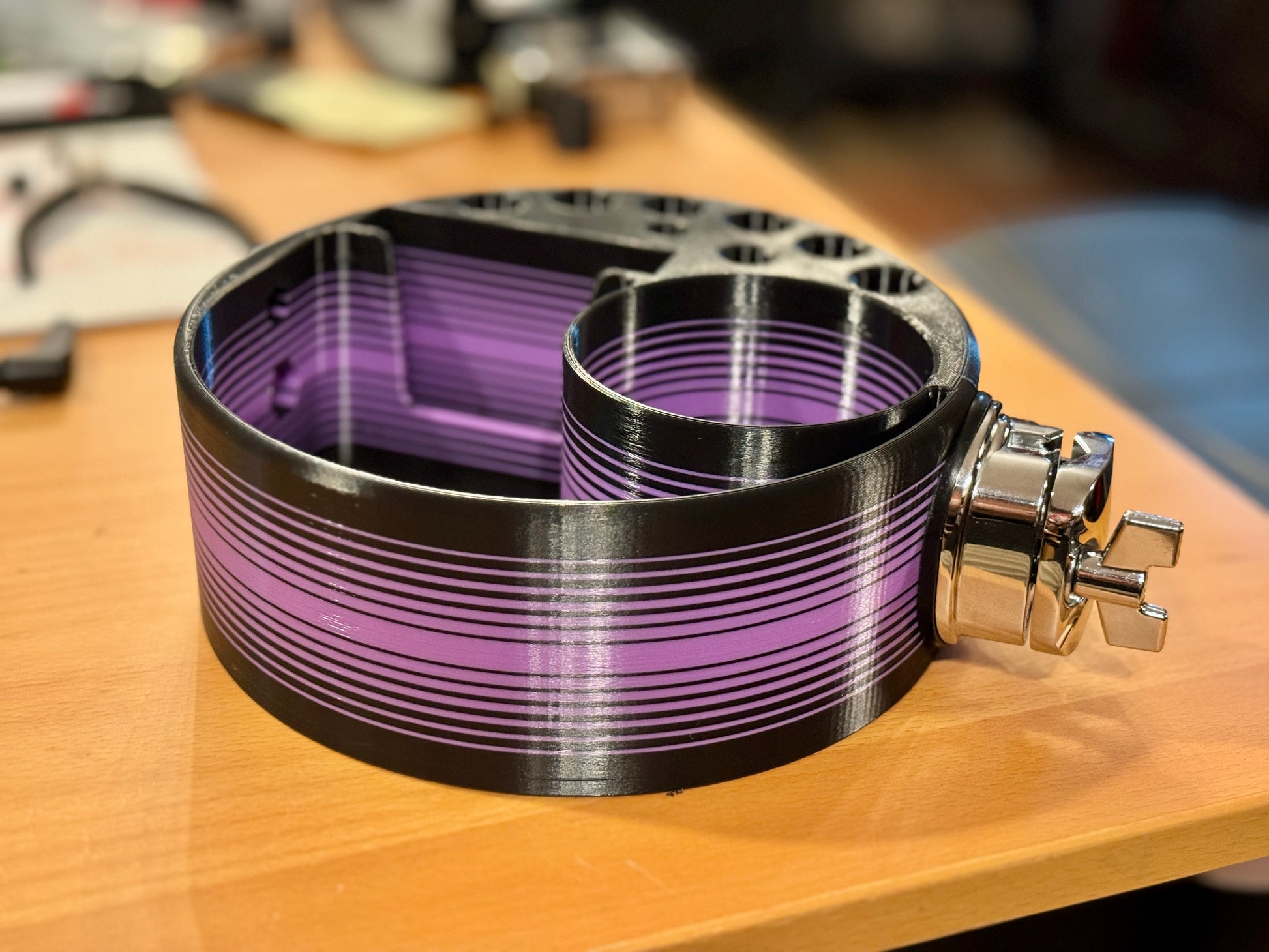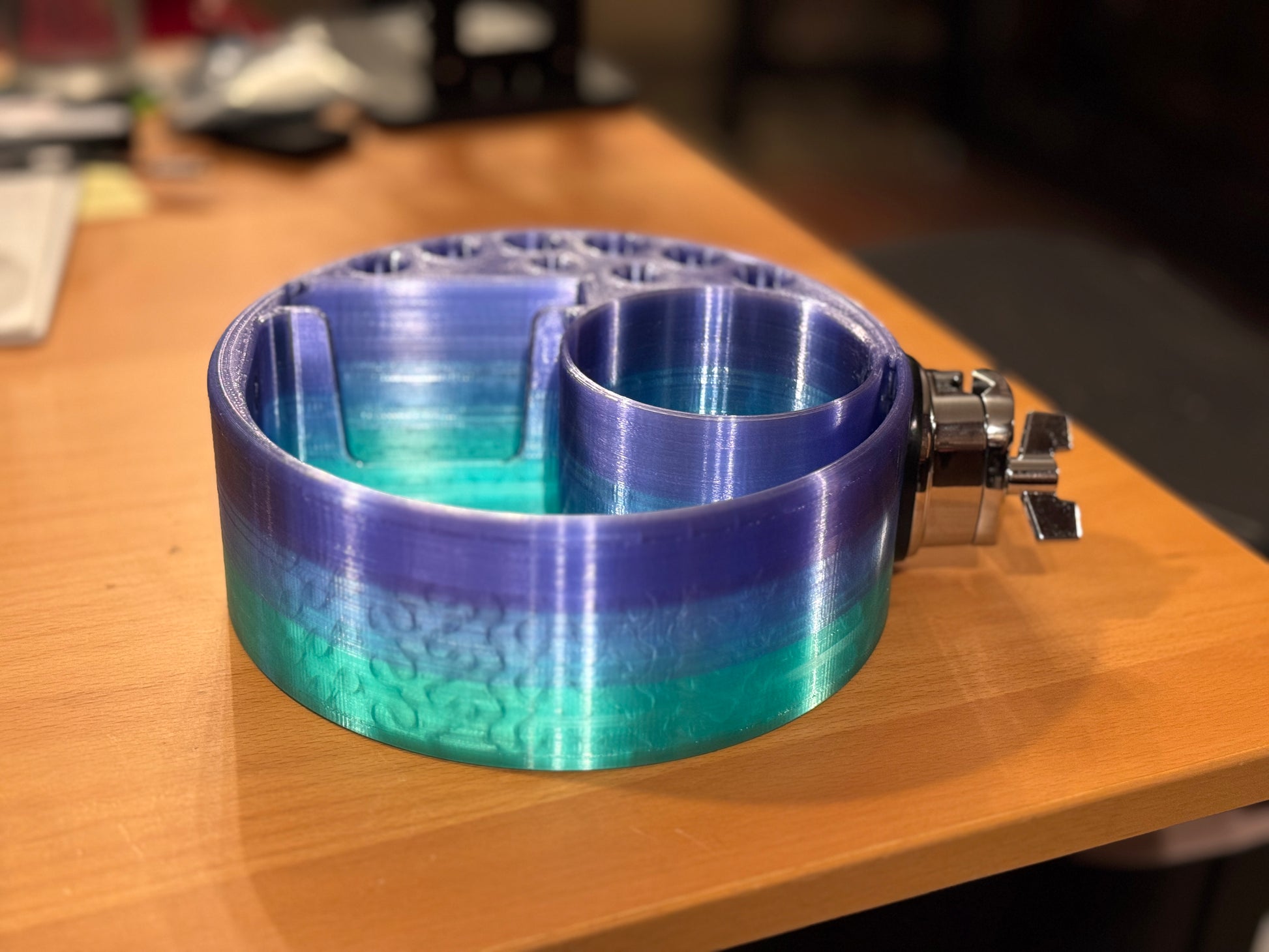 The Drum Buddy is the solution. 8" diameter x 3" deep and lightweight 3d printed out of ABS or PETG.
